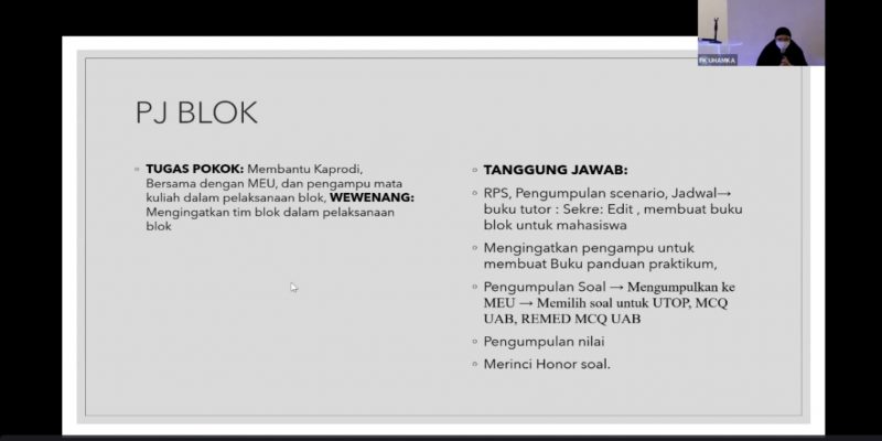 Seorang peserta menyampaikan “Acara ini sangat barmanfaat bagi saya selaku PJ Blok, saya lebih memahami tupoksi saya secara keseluruhan, serta memahami alur kerja saya dengan baik. Saya harap acara ini dapat dilaksanakan setiap tahun mengingat setiap tahun aka ada pergantian penanggung jawab mata kuliah blok,” tuturnya.