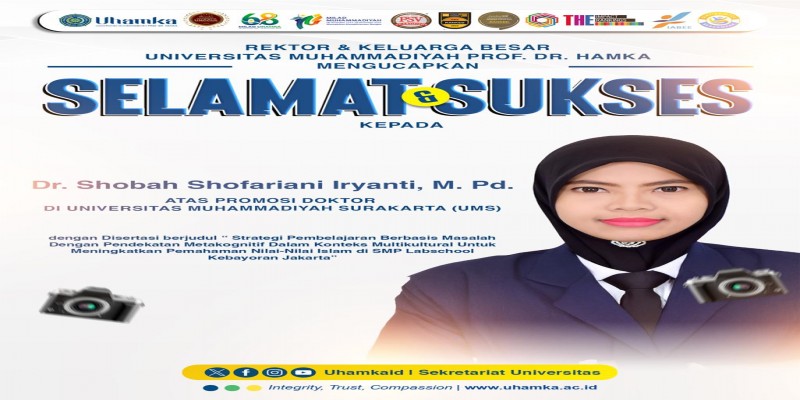 Universitas Muhammadiyah Prof. Dr. HAMKA (Uhamka) kembali mencatat prestasi membanggakan dengan keberhasilan lima dosen tetap Fakultas Agama Islam (FAI) meraih gelar doktor dari Program Studi S3 Pendidikan Agama Islam (PAI) di Universitas Muhammadiyah Surakarta (UMS). Satu dianataranya ialah Dr. Shobah Shofariani Iryanti, M.Pd., dosen Pendidikan Agama Islam di Uhamka.